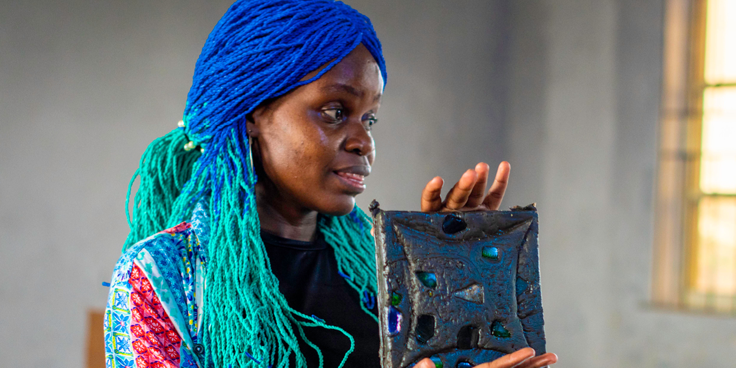 To conclude a collaboration with Peter Abayomi of Eran Jije Project initiated on arrival in Lagos, Katesi Kalange returned to Bariga to share the outputs of her residency with the local residents some of whom had been instrumental in helping her shape her residency project. Shortly after arriving in the city, Katesi conducted a community cleaning drive in the Isale-Akoka area of Bariga that was followed by in-depth material research, experimentation, and collaboration with artisans and recycling organisations in Lagos and beyond.