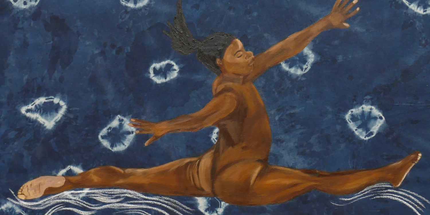Faithful Leap, 2025. Indigo, batik, oil, glass beads on canvas (cropped). Image courtesy of the artist.