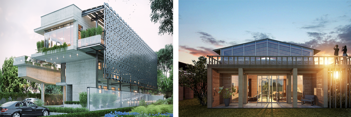 A visualisation of the Lagos Guest Artist Space by NS Design (L), A visualisation of the Ijebu Farm House by MOE+ Art Architecture (R).