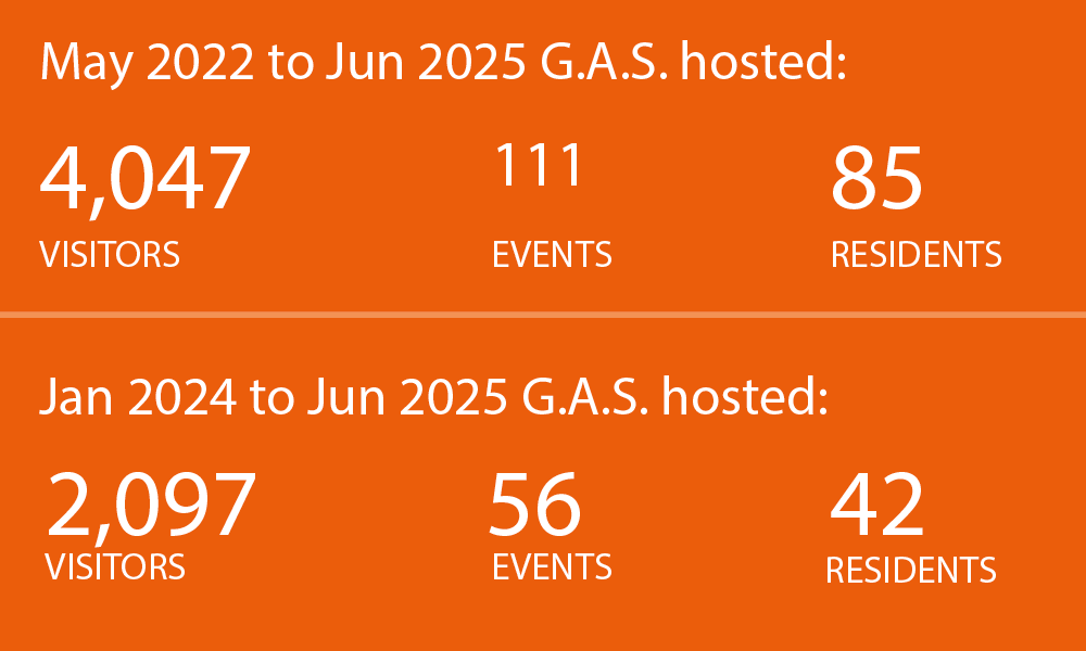 Between January 2024 and June 2025, G.A.S. Foundation hosted 42 residents, held 56 events across our two residency sites, and welcomed 2,097 visitors. From our inception in May 2022 to June 2025, we have hosted 85 residents, held 111 events, and welcomed a total of 4,047 visitors.